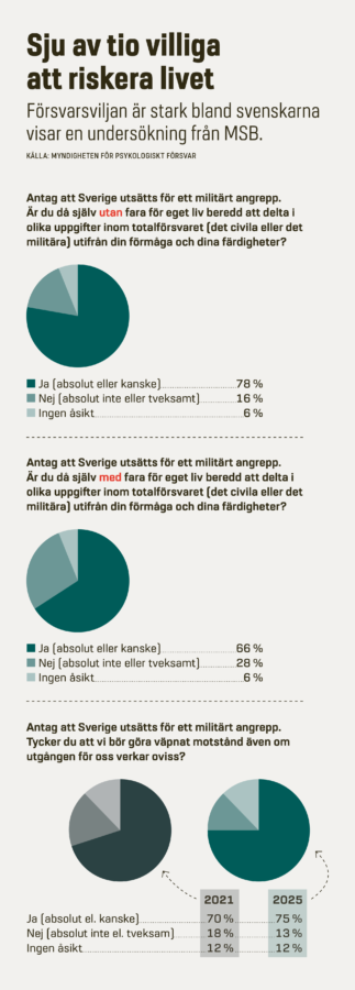 – Alla ska göra sin plikt och sin del. Men det innebär inte att alla i en krigssituation ska bege sig till fronten för att slåss, något man bör ta hänsyn till när man diskuterar försvarsviljan. En del ska se till att skola, vård, omsorg och andra väsentliga samhällsfunktioner fungerar. Det är dessutom en förutsättning för att det militära försvaret ska kunna utföra sin del.